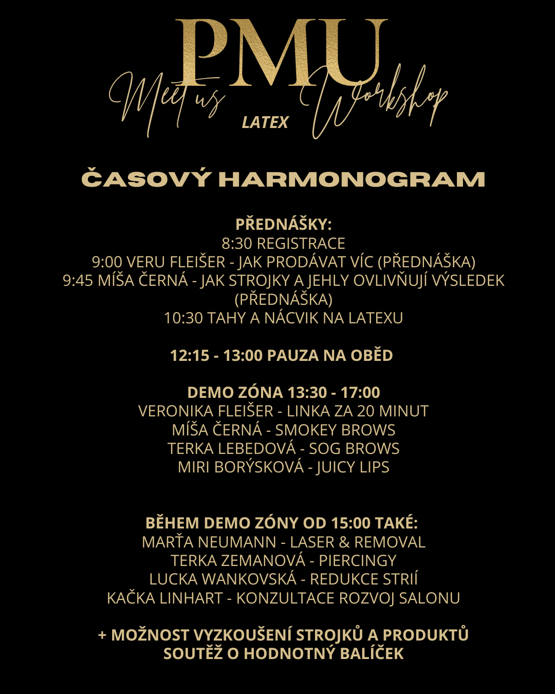 Hlavní náplní dne bude zejména nácvik a zdokonalení tahů na latexu a dále se budete moci dívat na live demo práce školitelů. Tento workshop je určen pro všechny, kteří se chtějí zdokonalit, naučit něco nového nebo si rozšířit obzory a držet trendy nejen v PMU oblasti.